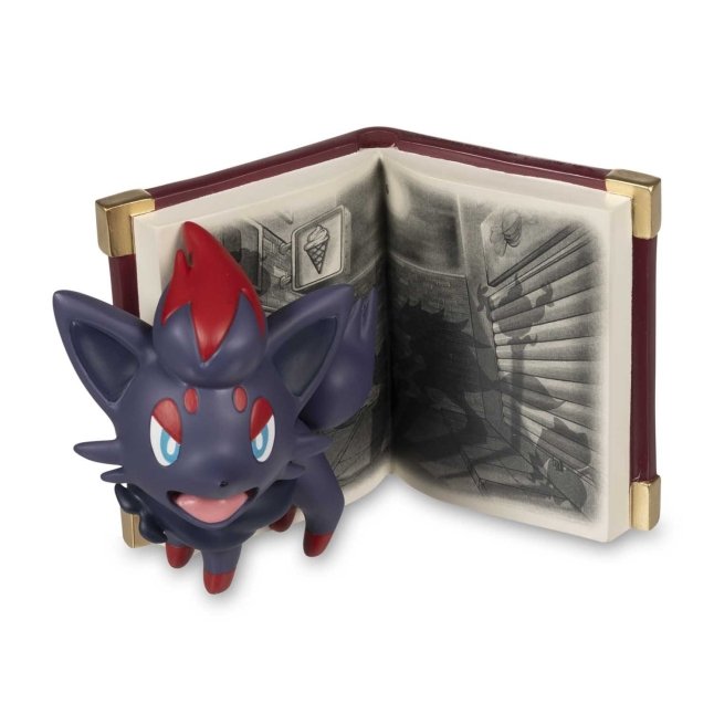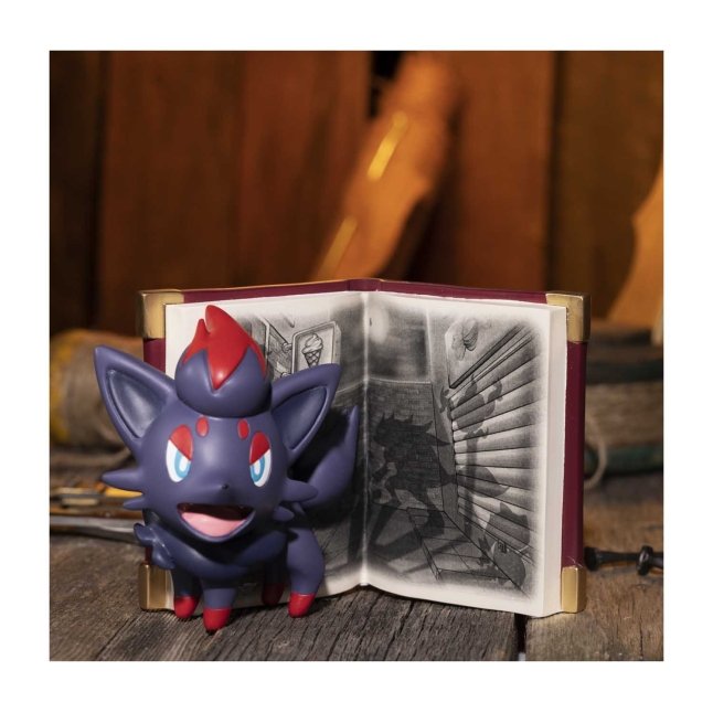 The Pokémon Scary Stories: Story of Zorua Figure features Zorua in front of a red storybook with a Vic Lee illustration depicting multiple shadows and Pokémon silhouettes. Zorua are timid Pokémon who sometimes transform into people or other Pokémon to blend in and play tricks. This timid disposition seems to be what led to the development of Zorua's special power. Don't worry, though—while this figure won't transform and play tricks on you, it's still a spooky addition to a nightstand or shelf.