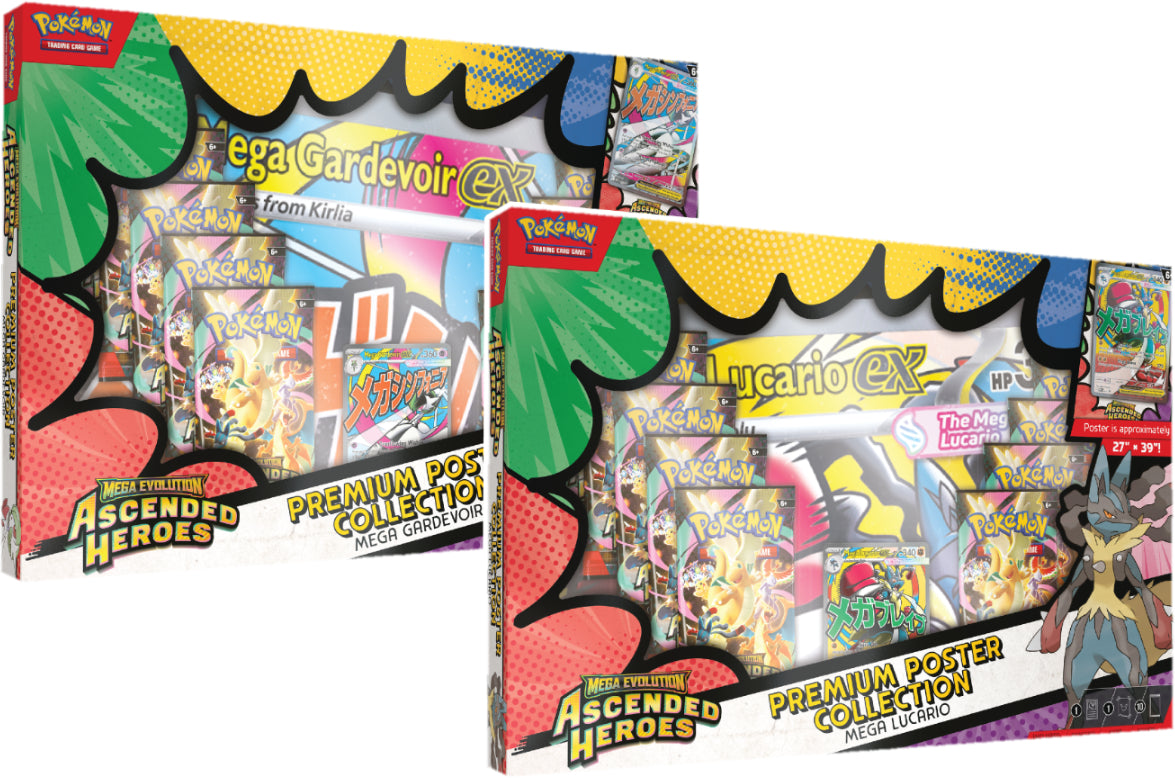 Decorate Your Space with Mega Lucario ex or Mega Gardevoir ex! With strong attacks and big HP, Mega Lucario ex and Mega Gardevoir ex break through boundaries in battle! Team up with one of these powerful Mega Evolution Pokémon ex as a full-art foil promo card, then find even more Pokémon inside a stack of 10 booster packs from Mega Evolution—Ascended Heroes. You’ll also get a large poster showing off Mega Lucario or Mega Gardevoir and other Pokémon featured in this special expansion